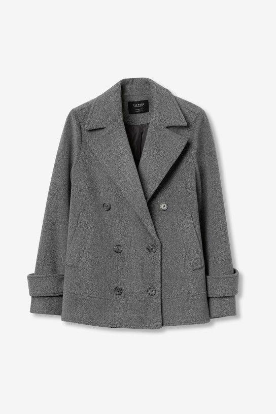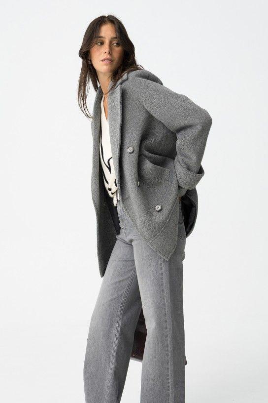 Chaqueta regular fit con doble botonadura. Solapa ancha y dos bolsillos laterales. Puños con tira decorativa y botón.