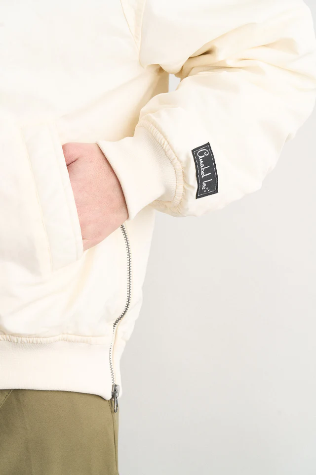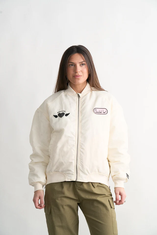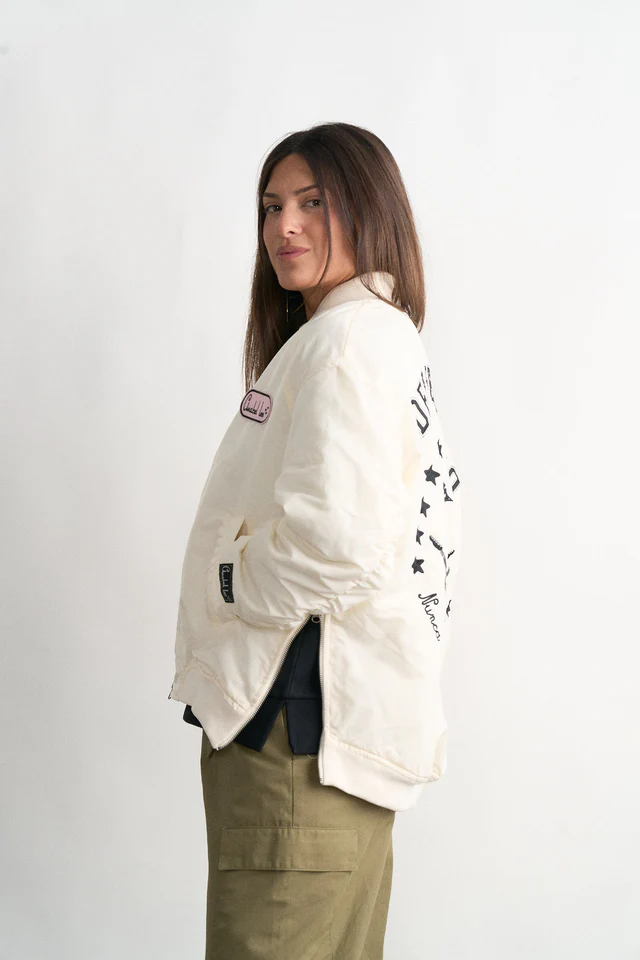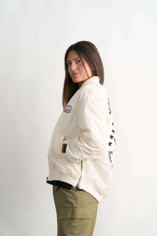 -Chaqueta bomber de cuello redondo, con abertura de cremallera y manga larga acabada en puño.