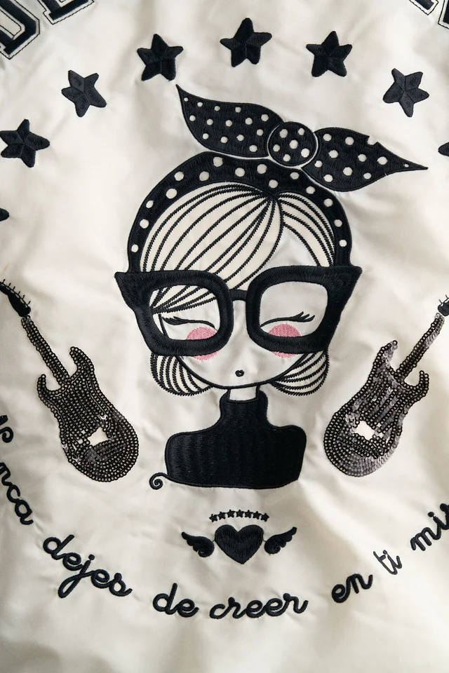 -Maxi ilustración bordada, con detalle de lentejuelas negras.
