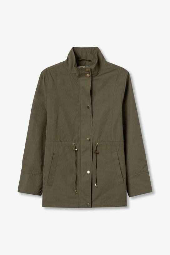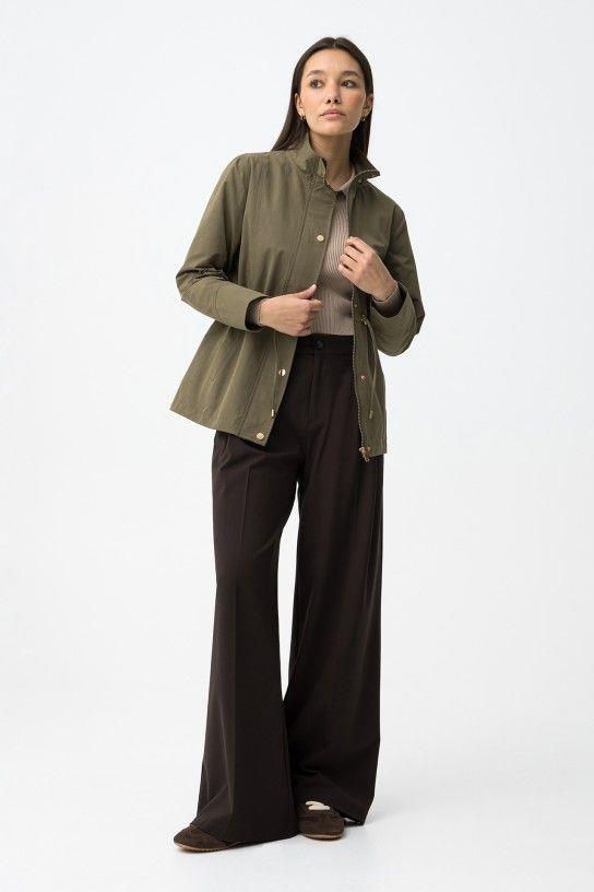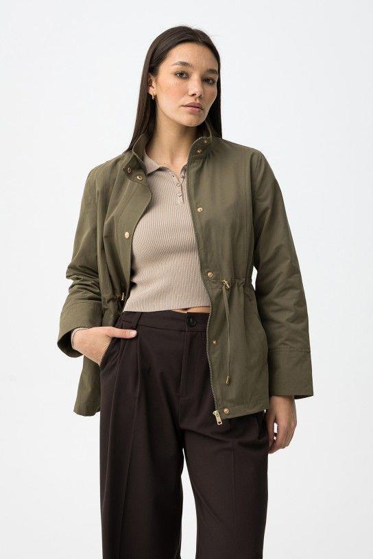 Chaqueta verde de corte regular con cierre de botones y cintura ajustable con cordón.