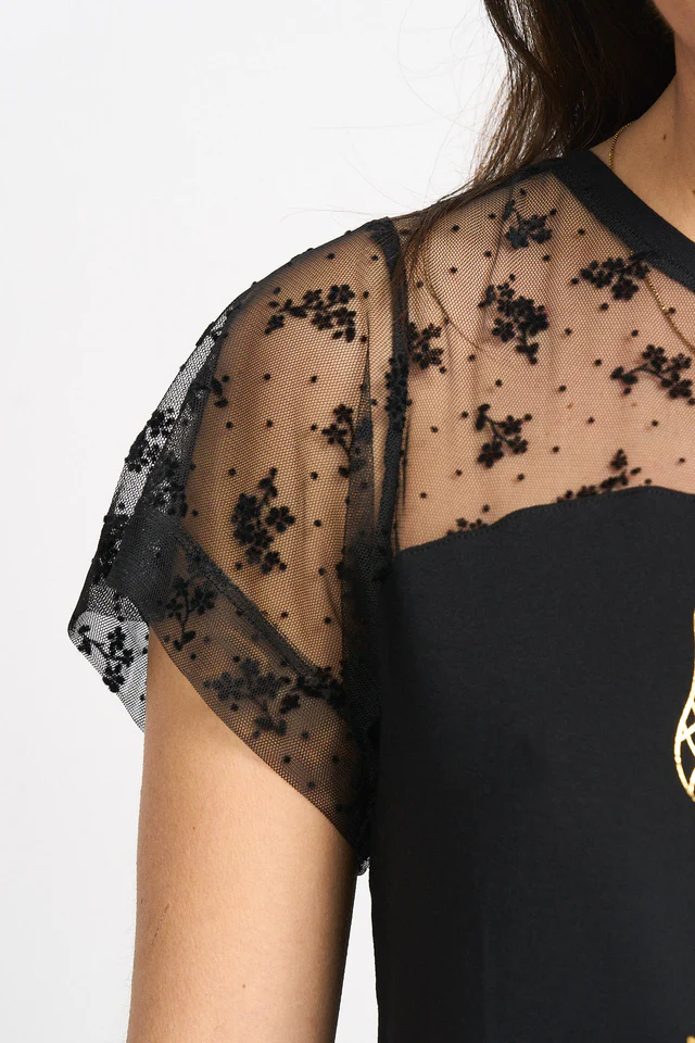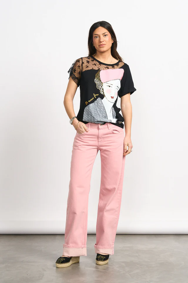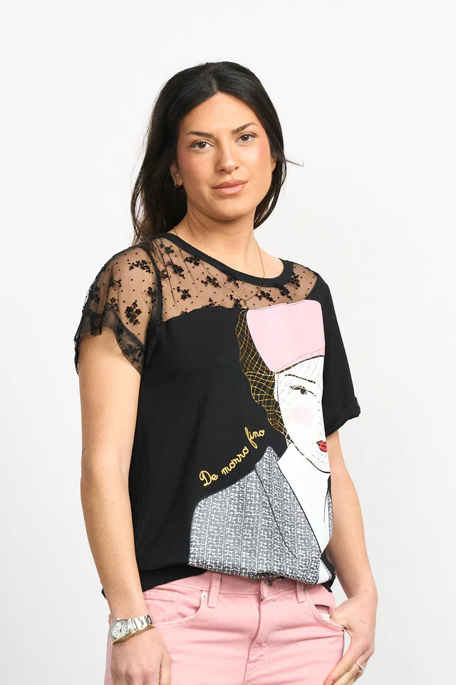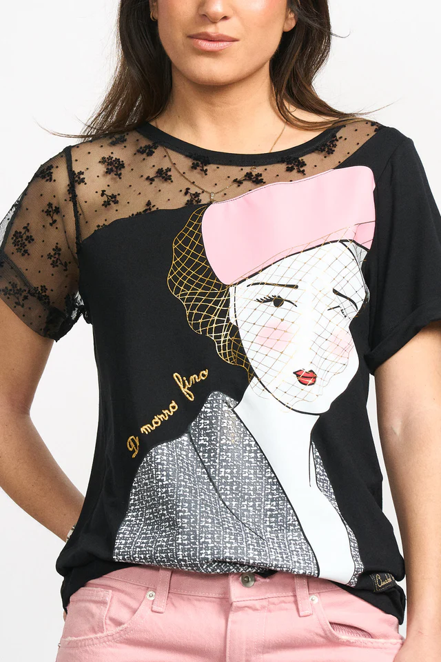 "De morro fino" -Camiseta de manga corta y cuello redondo. -Detalle de puntilla con relieve de foco, en manga y hombro derecho. -Maxi print delantero con foil y frase bordada en lurex dorado.