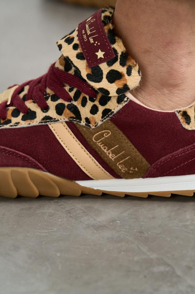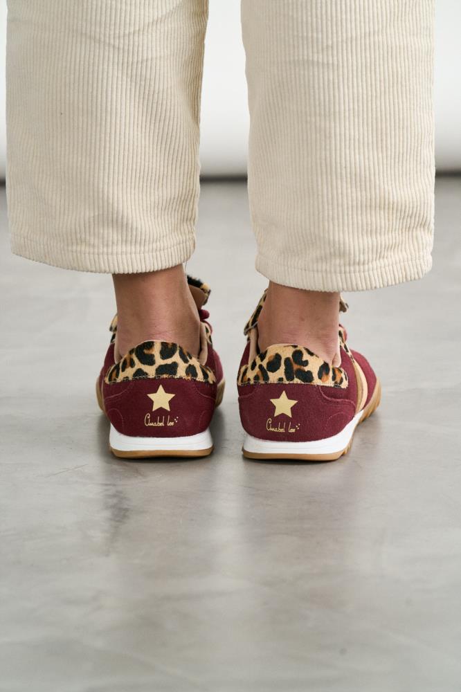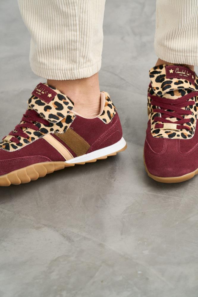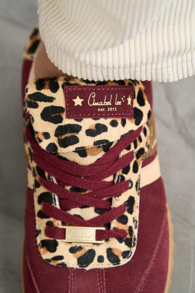 Zapatilla de color burdeos con detalles en animal print by Anabel Lee. Cordón plano con detalle de chapa dorada grabada con logo Anabel Lee. Exterior superior de piel seraje de alta calidad en color burdeos, combinado con piezas en piel con estampado animal print. Talón acolchado con costuras reforzadas y pieza en animal print con detalle de estrella y logo. Lengüeta con parche Edición Especial en burdeos, con estrella y logo Anabel Lee estampados. Suela interior de espuma para mayor amortiguación y confort. Suela exterior en goma natural color caramelo, antideslizante, de alta resistencia y con diseño dentado para mayor flexibilidad y agarre. Bandas laterales en tono arena con logo Anabel Lee bordado.