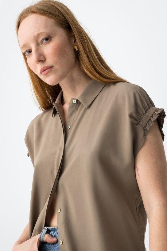 Camisa verde oliva, corte relaxed, manga corta con fruncido y botones frontales, estilo minimalista casual. 100% VISCOSE
