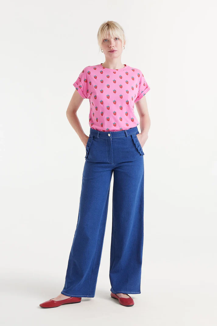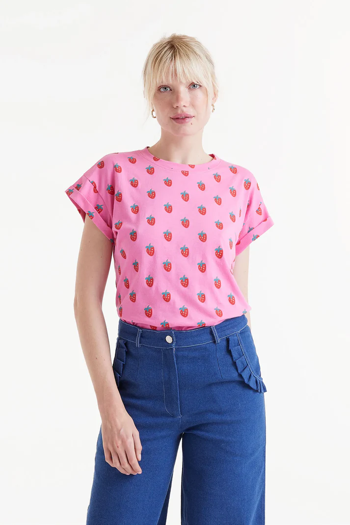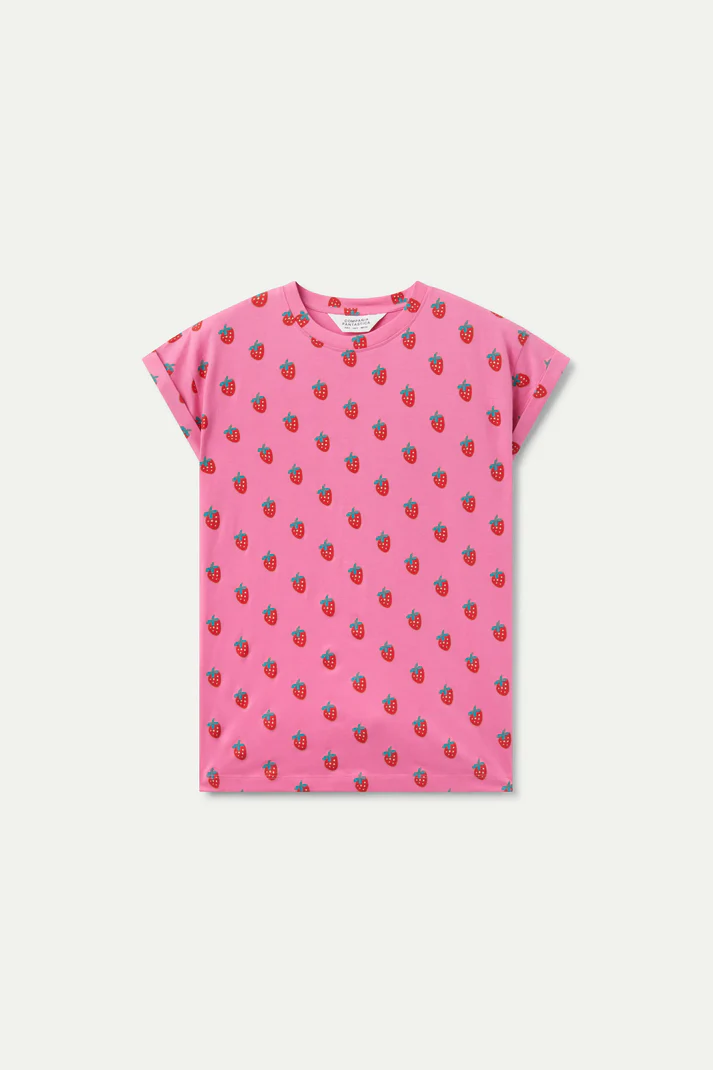 Camiseta en tejido circular de color rosa con estampado Sugar. Con cuello redondo y manga corta con vuelta.