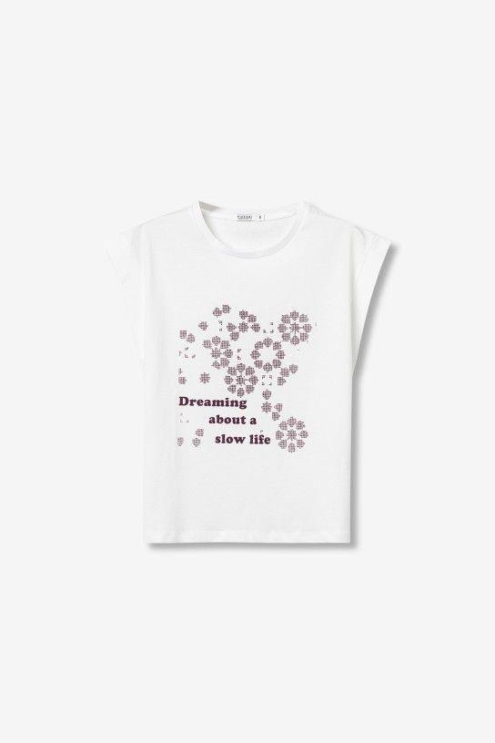 Camiseta blanca de manga corta, corte regular, con estampado floral y mensaje inspirador. 100% COTTON