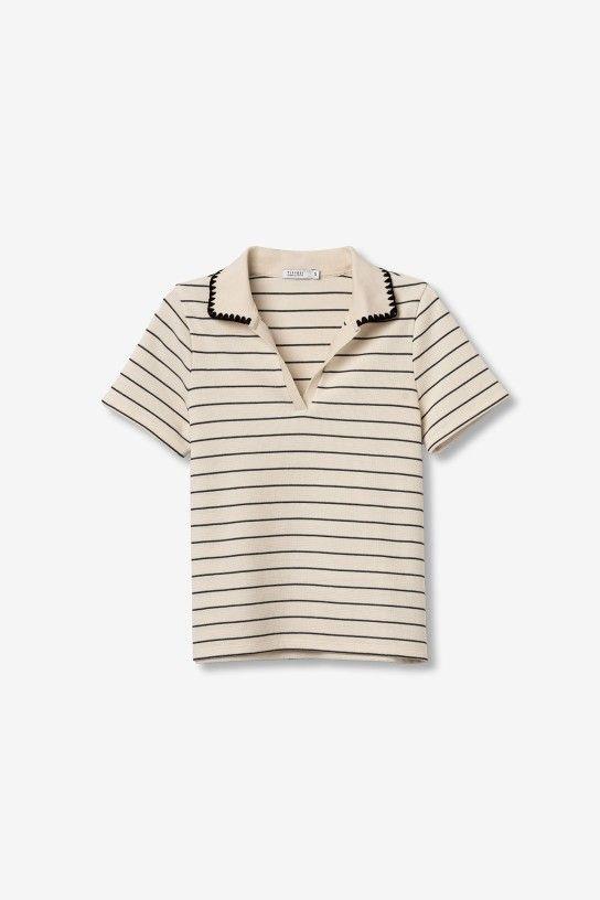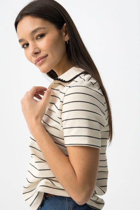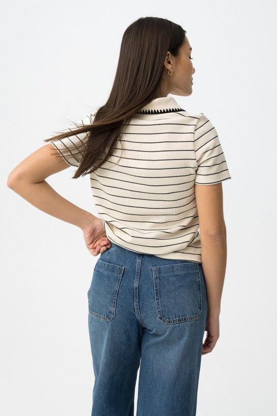 Camiseta de manga corta en beige con rayas negras, corte regular y cuello con ribete. 75% COTTON 21% POLYESTER 4% VISCOSE