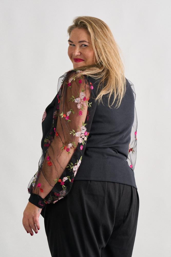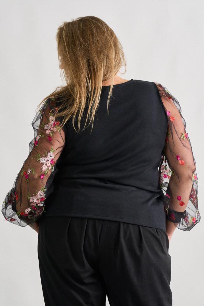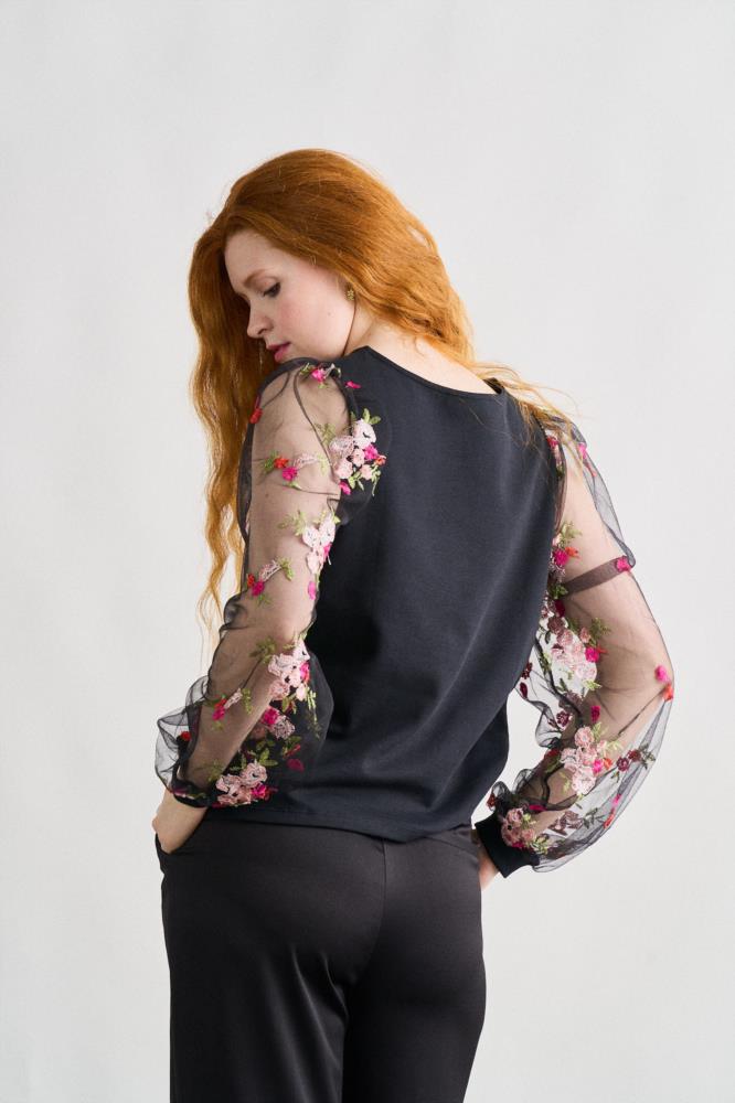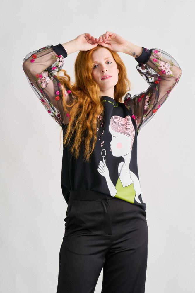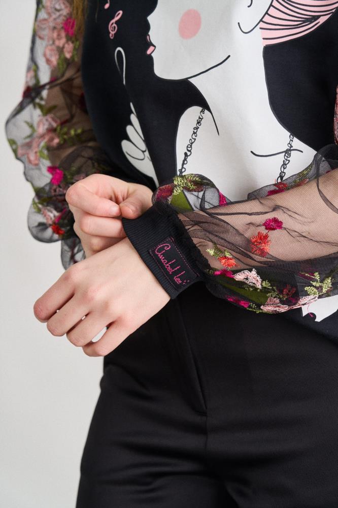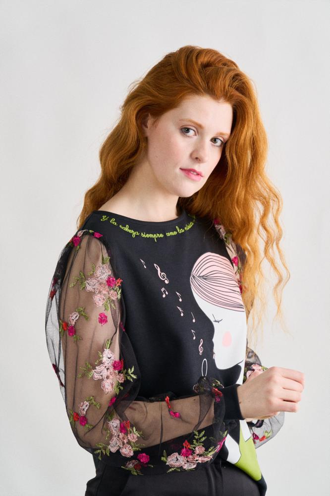 "Y la cabeza siempre como la música...bien alta." -Top de corte recto y cuello redondo. -Manga larga transparente con bordados. -Maxi print delantero y frase bordada en cuello.