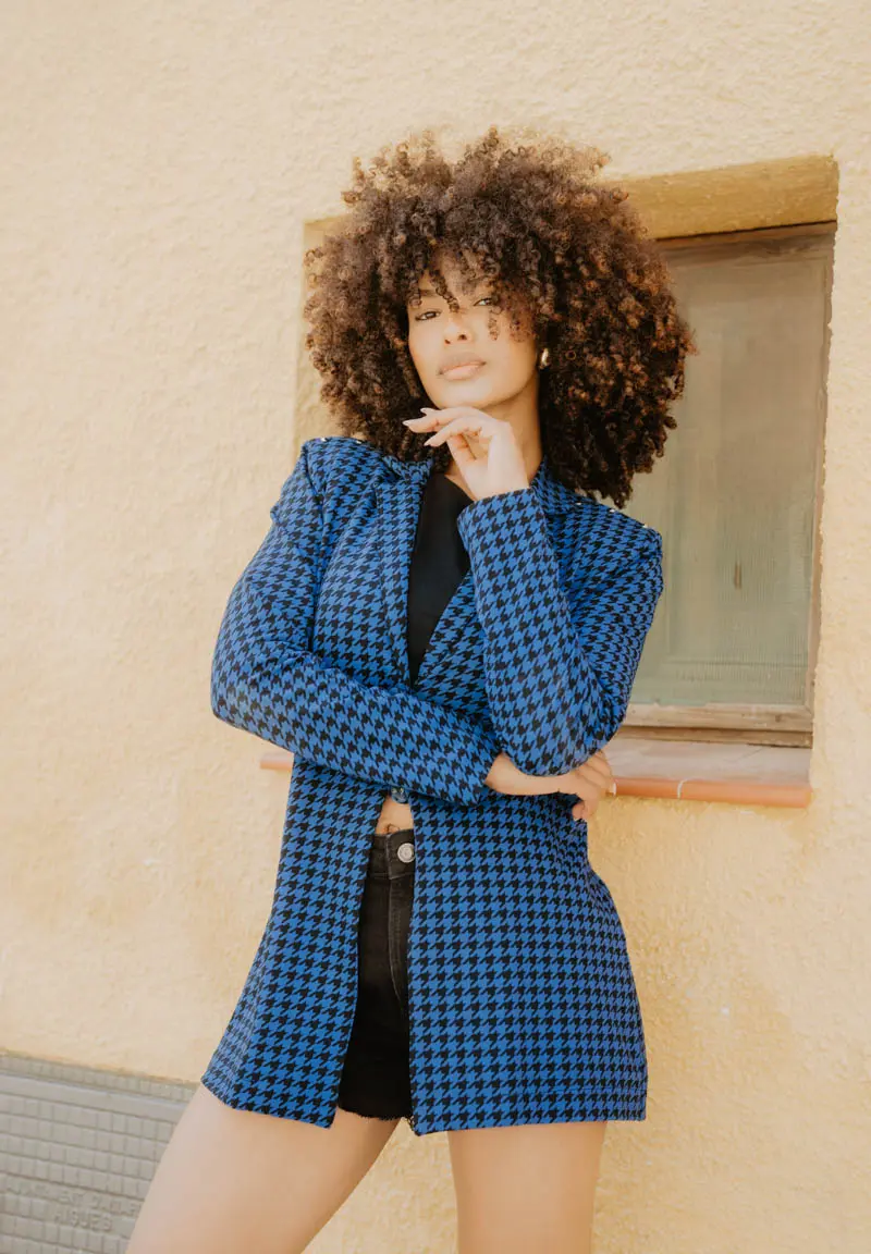Americana tipo oversize, con tachuelas en los hombros. Azul con estampado de pata de gallo. Lleva en la espaldal una pantera negra de tela superpuesta, bordada en su contorno, con estructura de tachuelitas, un animal que representa fuerza, poder y protección. Cuando la pantera negra llega a tu vida, es una llamada a la liberación de las ataduras y una invitación a empezar una nueva etapa. ¿Te atreves a llevarla con el pantalón a juego? Diseñada por Animosa en España y fabricada en Portugal, cuidando hasta el más mínimo detalle. Todas nuestras prendas llevan un marcapáginas con un texto inspirador.La modelo lleva una talla S y sus medidas son: altura 167, pecho 90, cintura 60 y cadera 90 cm.