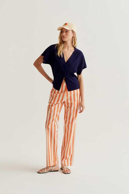 Cárdigan de tejido punto de color azul marino. Cuello pico con mangas corta. Cierre frontal con botones grandes de color rojo. Hombro ligeramente caído. La modelo mide 177 cm y lleva la talla S.