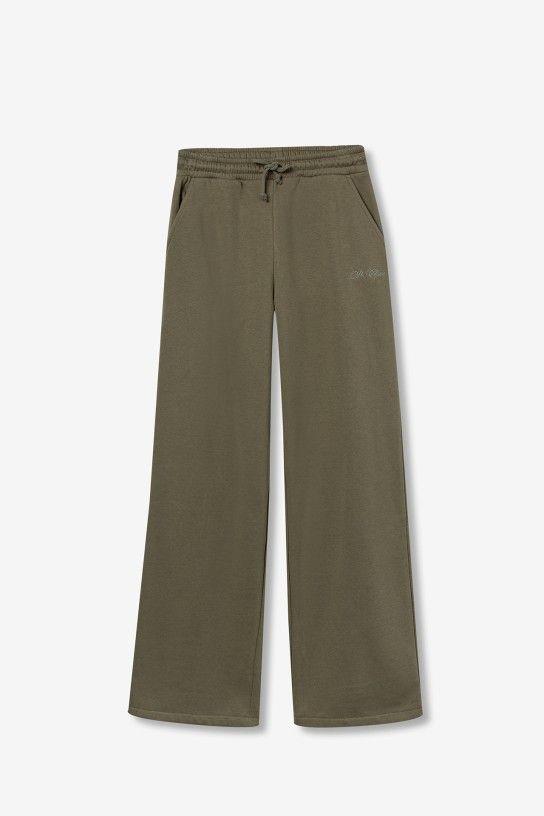 Pantalones wide leg en algodón. Cintura media con cinturilla elástica y cordón ajustable. Bolsillos laterales y pierna ancha. Detalle de bordado en el bolsillo frontal.