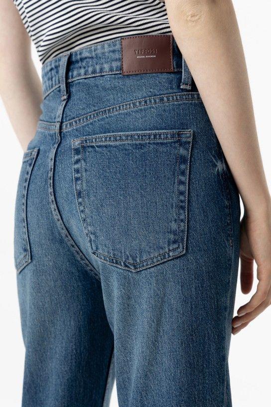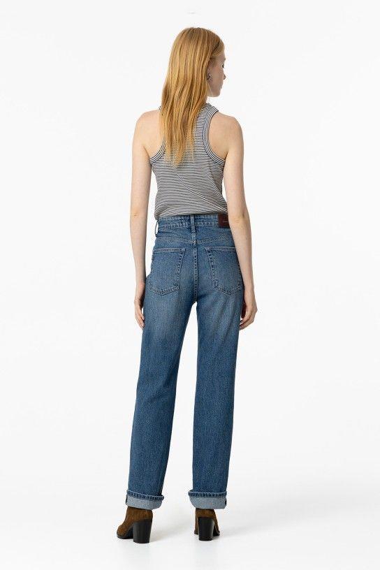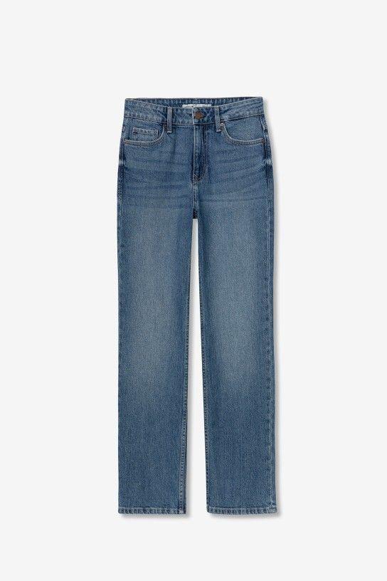 Jeans de tiro alto y pernera recta con cinco bolsillos. Cierre frontal con cremallera y botón metálico. 99% CO 1% EL