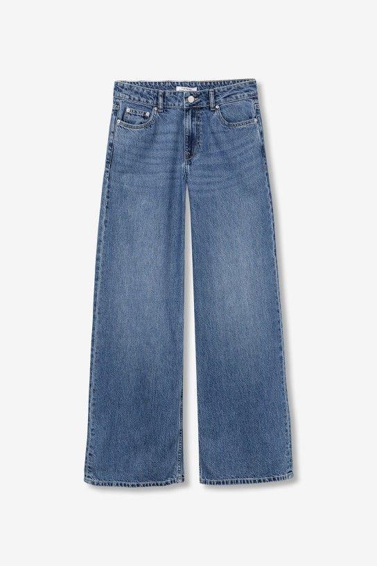Jeans azules de corte ancho y largo, estilo casual y moderno. 100% algodón.