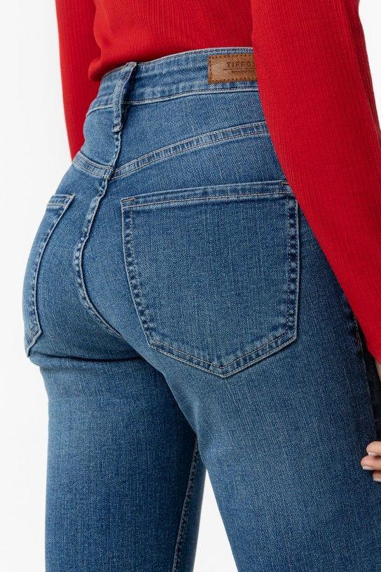 Vaqueros de corte acampanado con cintura alta, cinco bolsillos y cierre de botón metálico.