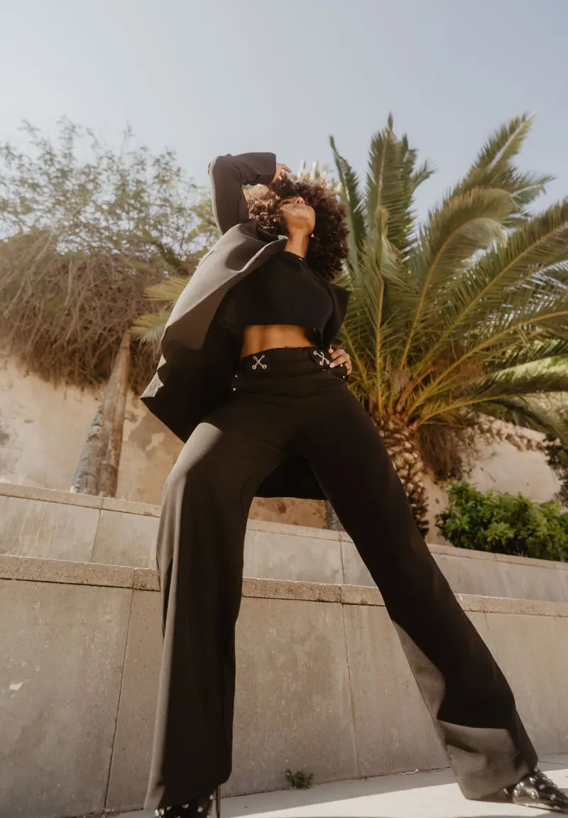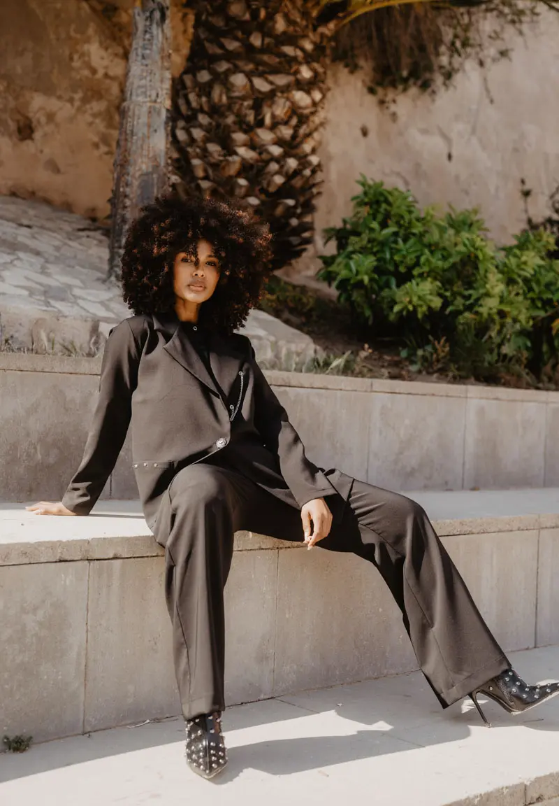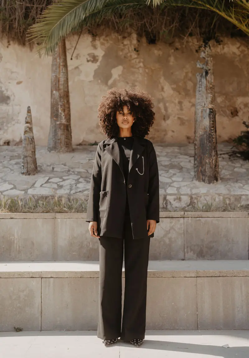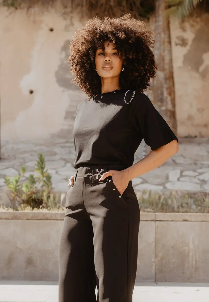 Pantalón de corte recto, con goma en la cintura. Lleva bolsillos decorados por tachuelas, y unas trabillas anchas decoradas con ollaos y cadenas cruzadas. Es brutal. Solo necesitas una camiseta básica si quieres contrarrestar tanto power. O llevarlo con la chaqueta que hemos diseñado a conjunto. Diseño propio y fabricación en Portugal, cuidando hasta el más mínimo detalle. Todas nuestras prendas llevan un marcapáginas con un texto inspirador.La modelo lleva una talla S y sus medidas son: altura 167, pecho 90, cintura 60 y cadera 90 cm.