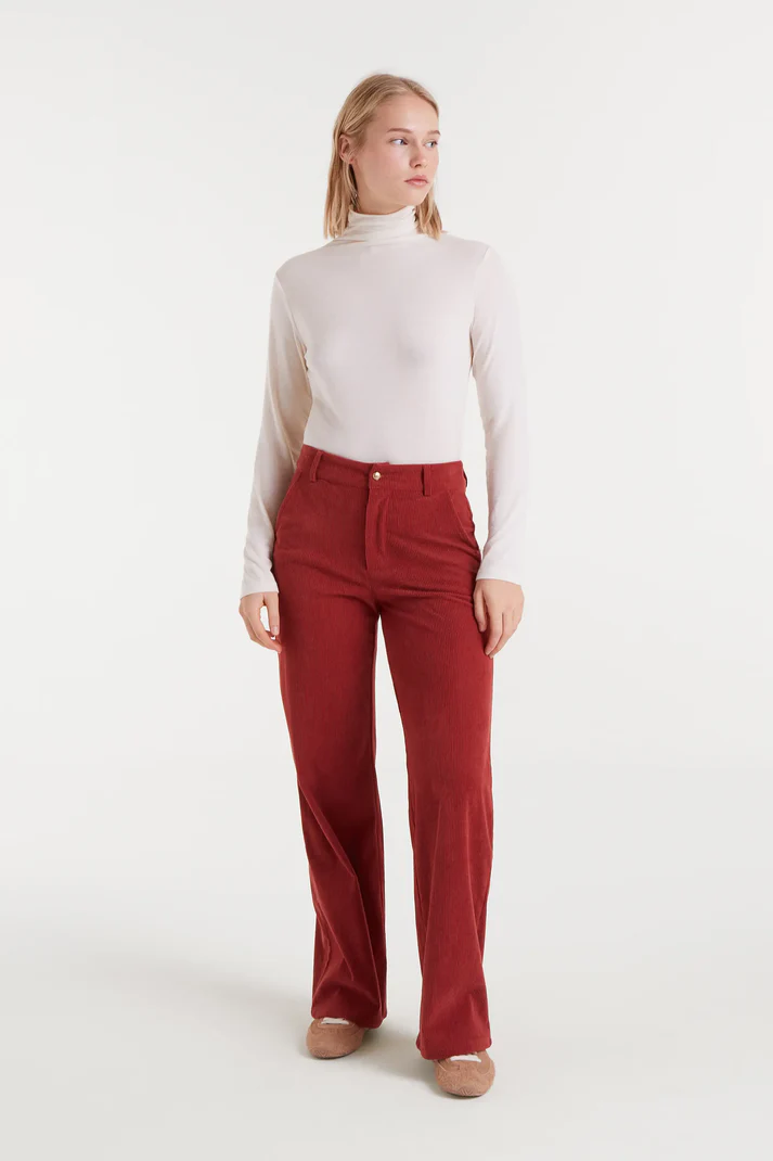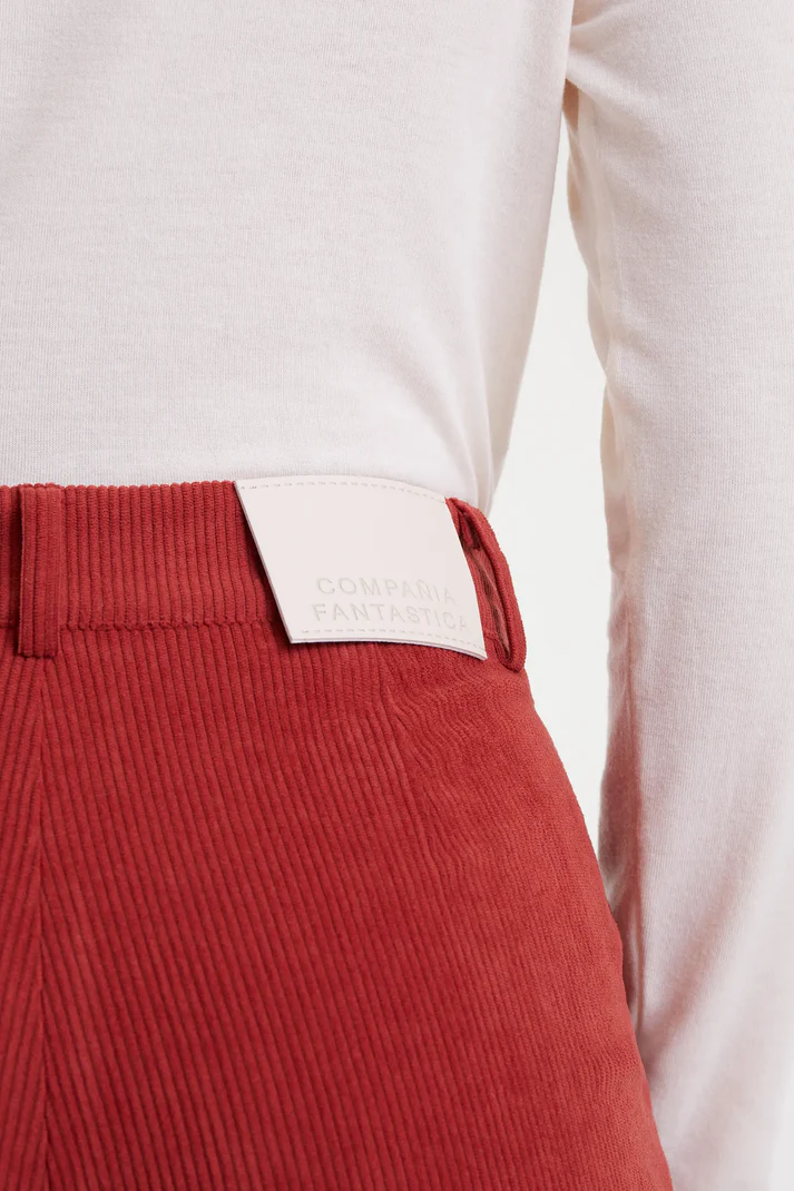 Pantalón con tejido de pana de color marrón. Con cintura fija de tiro medio y pernera de corte recto. Cierre frontal con cremallera y botón metálico. Bolsillos laterales. La modelo mide 177 cm y lleva la talla S.