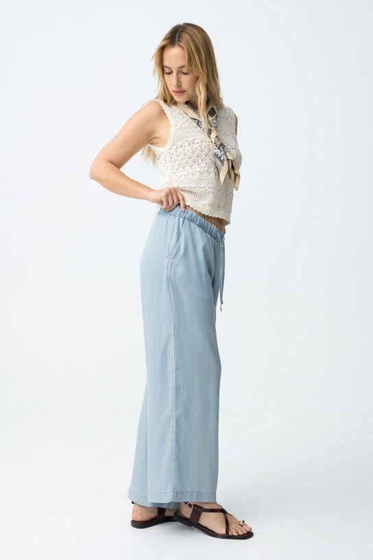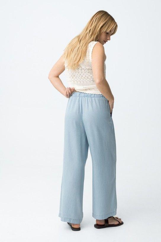 Pantalón azul claro de corte ancho, cintura alta con elástico y cordón ajustable, estilo relajado. 100% LYOCELL