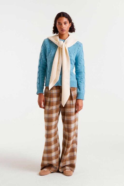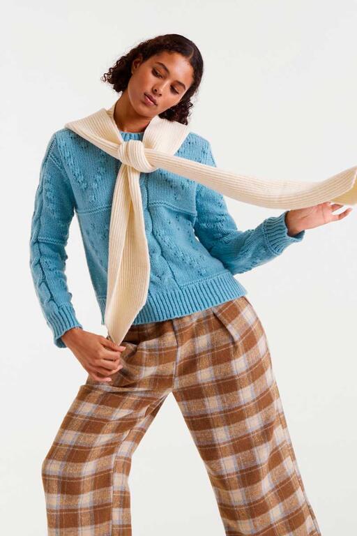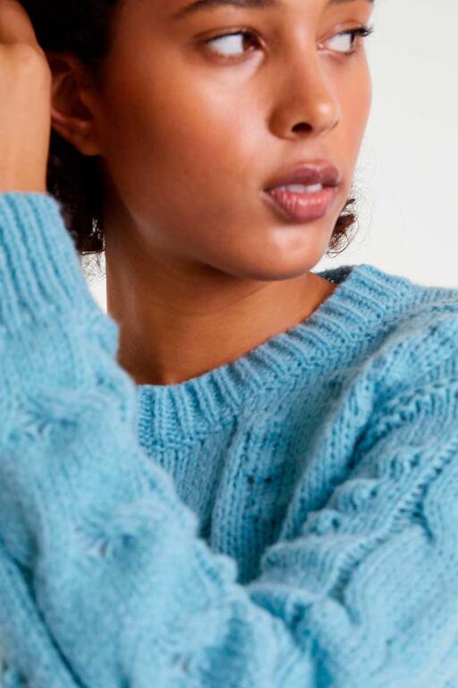 Jersey punto trenzado de color azul. Cuello redondo y manga larga. Detalles en rib. La modelo mide 175 cm y lleva la talla S.