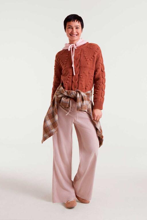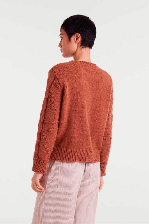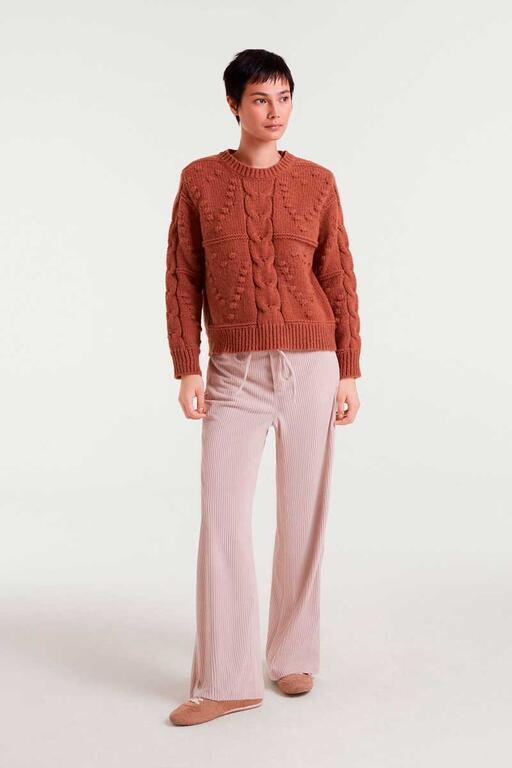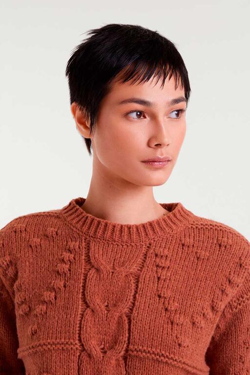 Jersey punto trenzado de color marrón. Cuello redondo y manga larga. Detalles en rib. La modelo mide 175 cm y lleva la talla S.