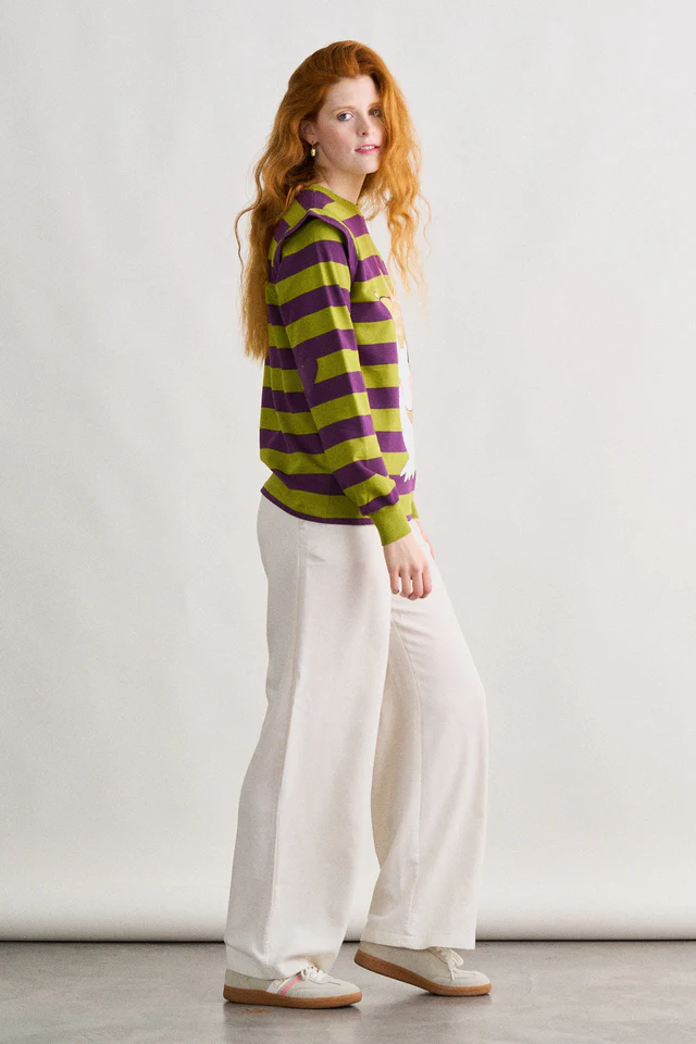 "Bésame, bésame mucho..." -Sudadera de rayas, manga larga y cuello redondo. -Volante pequeño sobre los hombros. -Detalle de corazón en los codos. -Maxi print delantero con foil dorado.