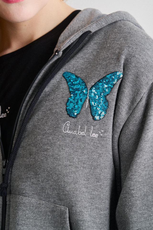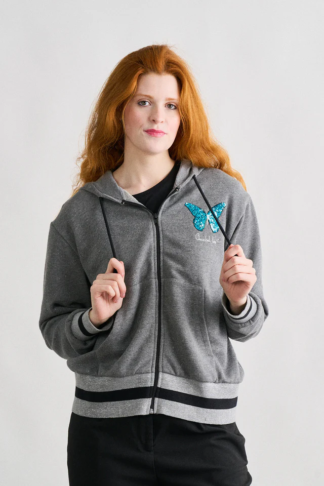 "Sin tiempo para malos rollos" -Chaqueta de corte oversize, ligeramente abullonado. -Manga larga, capucha ajustable con cordones y bolsillos laterales. -Detalle de tejido de la sudadera con hilo lurex -Cierre con cremallera. -Detalle de acabado en lurex en mangas y bajo. -Maxi print en espalda y print delantero con aplicación de lentejuelas.