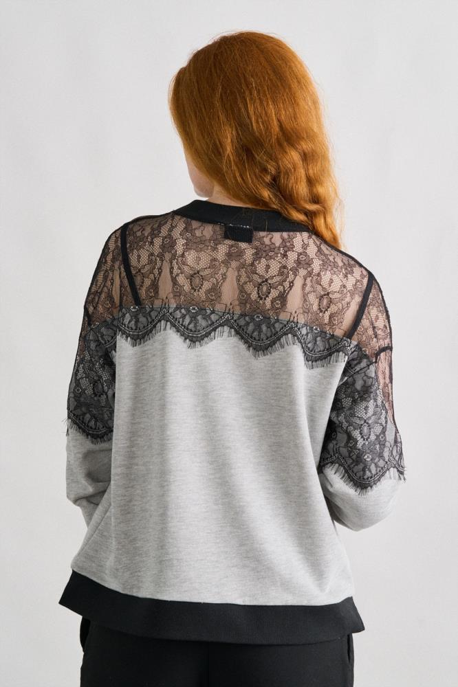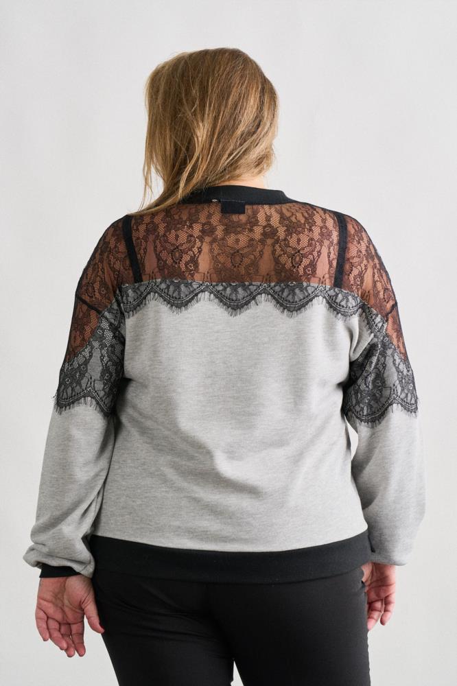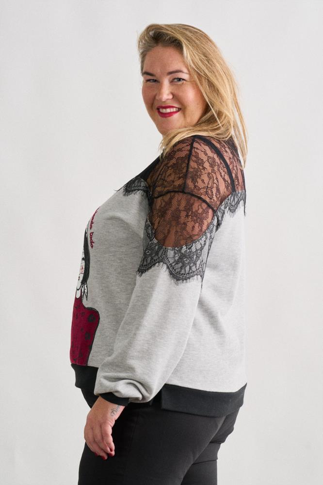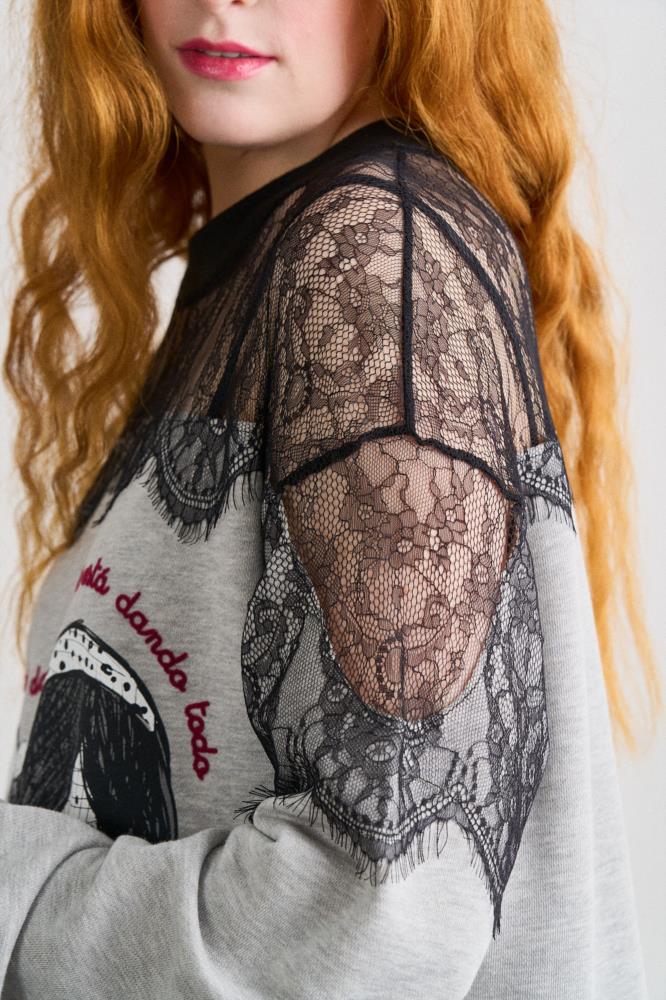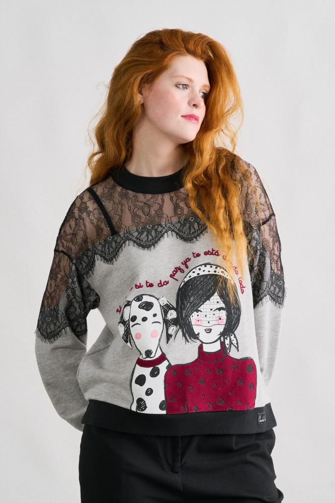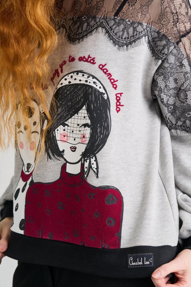 La sudadera está confeccionada en una suave felpa americana de rizo, de color gros claro y con un precioso encaje negro; la composición de la prenda es de 69% algodón y 31% poliéster. De línea recta y aberturas laterales en cinturilla, escote redondo con cenefa y manga larga con puño. El canesú delantero y espalda están realizados en encaje, los que se unen a la pieza superior de la manga, que también va en encaje; todo ello crea un efecto transparente que simula un escote barco. El precioso maxiprint delantero está serigrafiado en blanco y negro, combinando de una manera muy acertada con el tono burdeos que encontramos en los detalles en flocko, como son: el jersey de la chica, el collar del dálmata y la frase. La etiqueta textil exterior va en negro con letras en lurex plata.