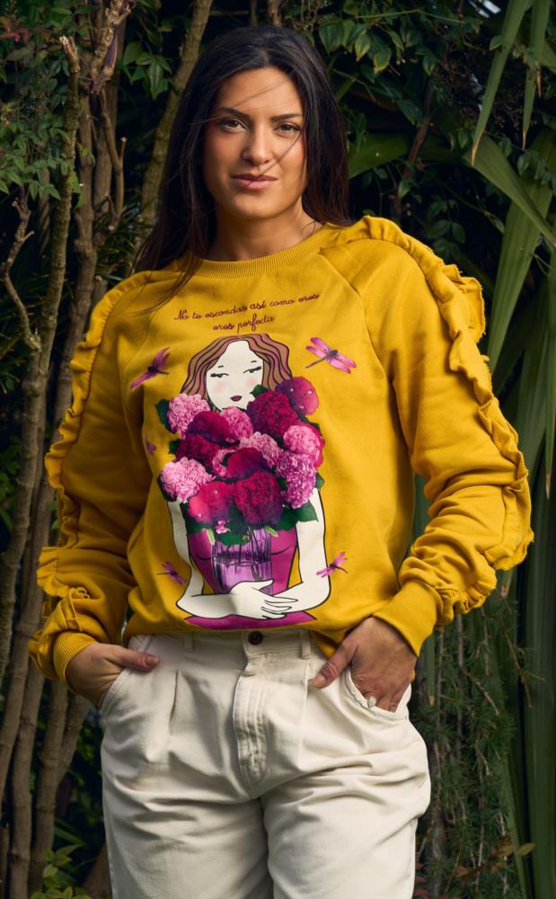 "No te escondas, así como eres, eres perfecta" -Sudadera felpada de corte oversize. -De corte recto y cuello redondo. -Manga raglán, con detalle de pequeños volantes incrustados. -Maxi print delantero con detalle de strass de piedras sobre la ilustración. -Detalle de corazón bordado en hilo lurex en la parte trasera.