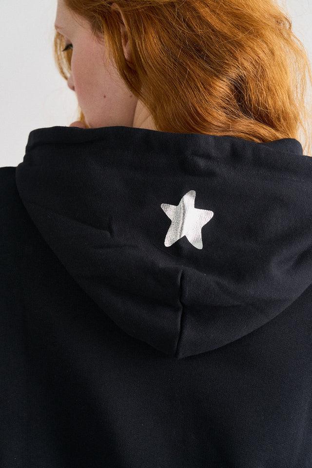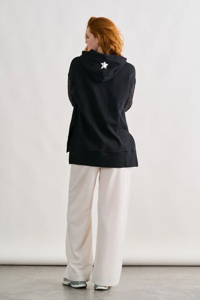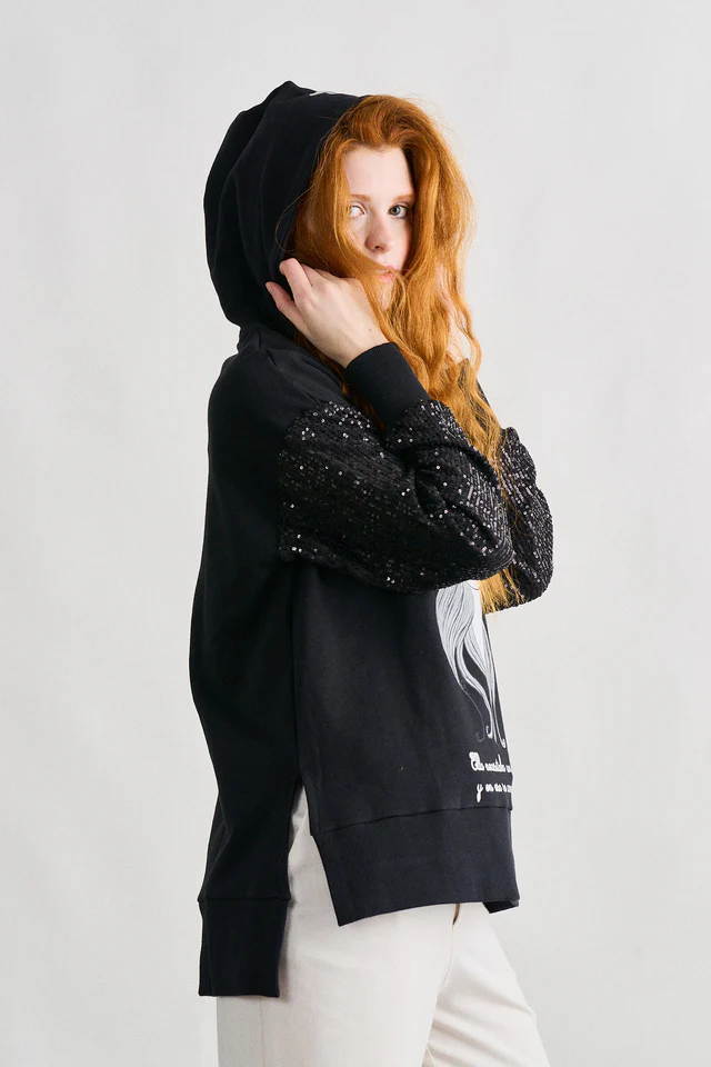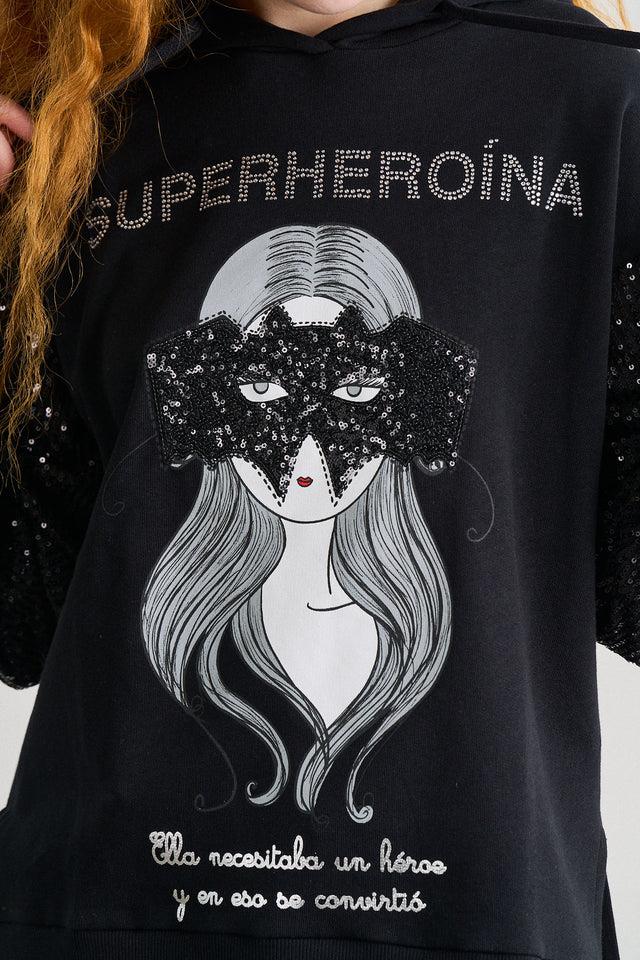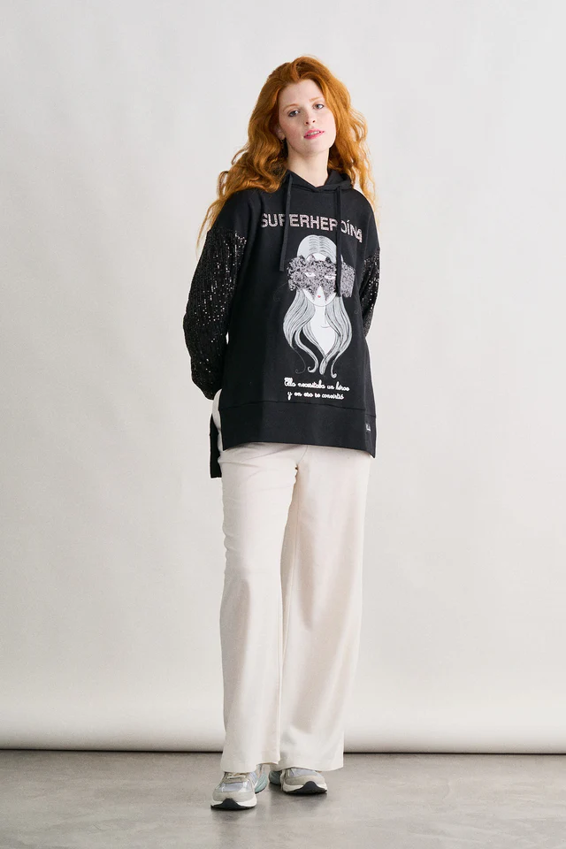 "Ella necesitaba un héroe y en eso se convirtió" -Sudadera felpada, con aberturas laterales y largos desiguales. -Capucha ajustable con cordones. -Manga larga con lentejuelas forradas en el interior. -Maxi print delantero con detalle de lentejuelas, cristalitos y foil. -Print con foil sobre la capucha.
