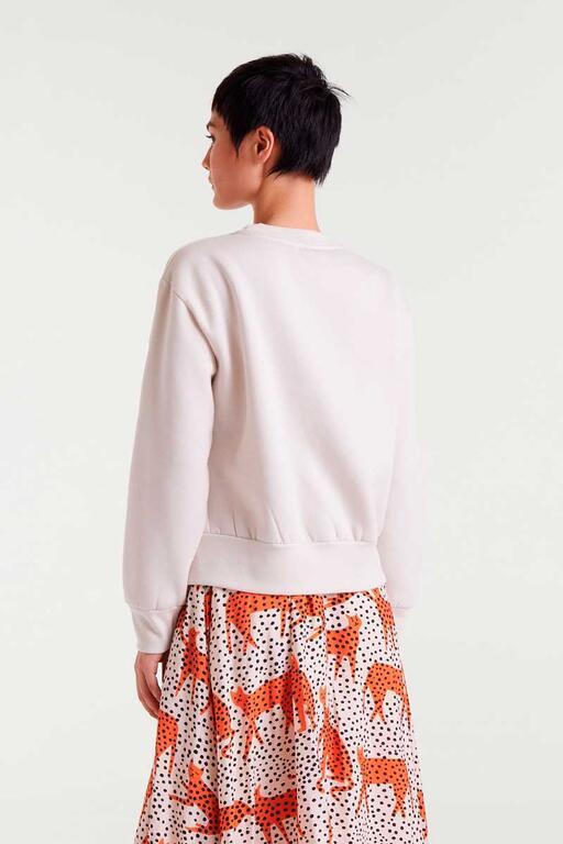 Sudadera blanca con estampado Cat Lover Since Forever. Cuello redondo y manga larga. Hombro caído ligeramente. Detalles acabados en rib. La modelo mide 177 cm y lleva la talla S.