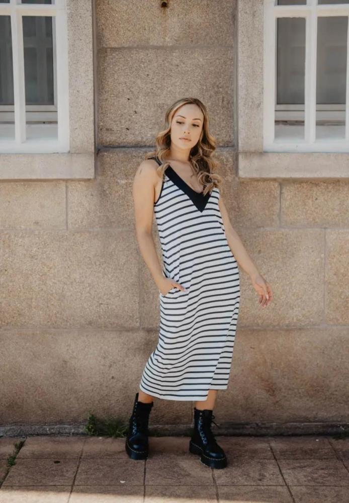 Vestido largo sin mangas, cuello marinero y escote pronunciado en la espalda. Con bolsillos. La ilustración del centro está delicadamente bordada: una calavera marinera sobre un ancla. Es reversible: puedes llevarlo con el escote en el delantero y la ilustración en la espalda. Aunque no esté en el imaginario colectivo, siempre ha habido mujeres que se lanzaron a los mares, ya fuera por el sustento, la protección de su país, el amor o la venganza. Aquí tienes solo unos nombres: Grace O’Malley, Anne Bonny, Mary Read, Ching Shih, Fanny Campbell… Diseñada por nosotras en Galicia y fabricada en Portugal, cuidando hasta el último detalle. En cada prenda encontrarás un marcapáginas que puede contener frases, poemas o historias de mujeres. La modelo lleva una talla S y sus medidas son: altura 170, pecho 87, cintura 68 y cadera 94 cm.