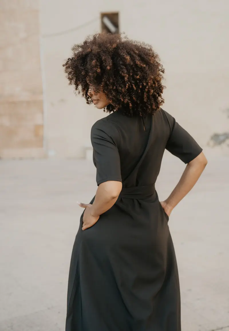 Vestido largo de manga francesa, fruncido en la cintura. Lleva unas trabillas anchas decoradas con ollaos y cadenas cruzadas, y un cinturón que ajusta más el talle. El cuello está decorado con tachuelas. El patrón nos traslada a los años 50, a iconos como Audrey Hepburn o Sophia Loren. Que no solo eran admiradas por su elegancia y sofisticación, sino también por su capacidad para romper moldes y desafiar las normas. Diseño propio y fabricación en Portugal, cuidando hasta el más mínimo detalle. Todas nuestras prendas llevan un marcapáginas con un texto inspirador.