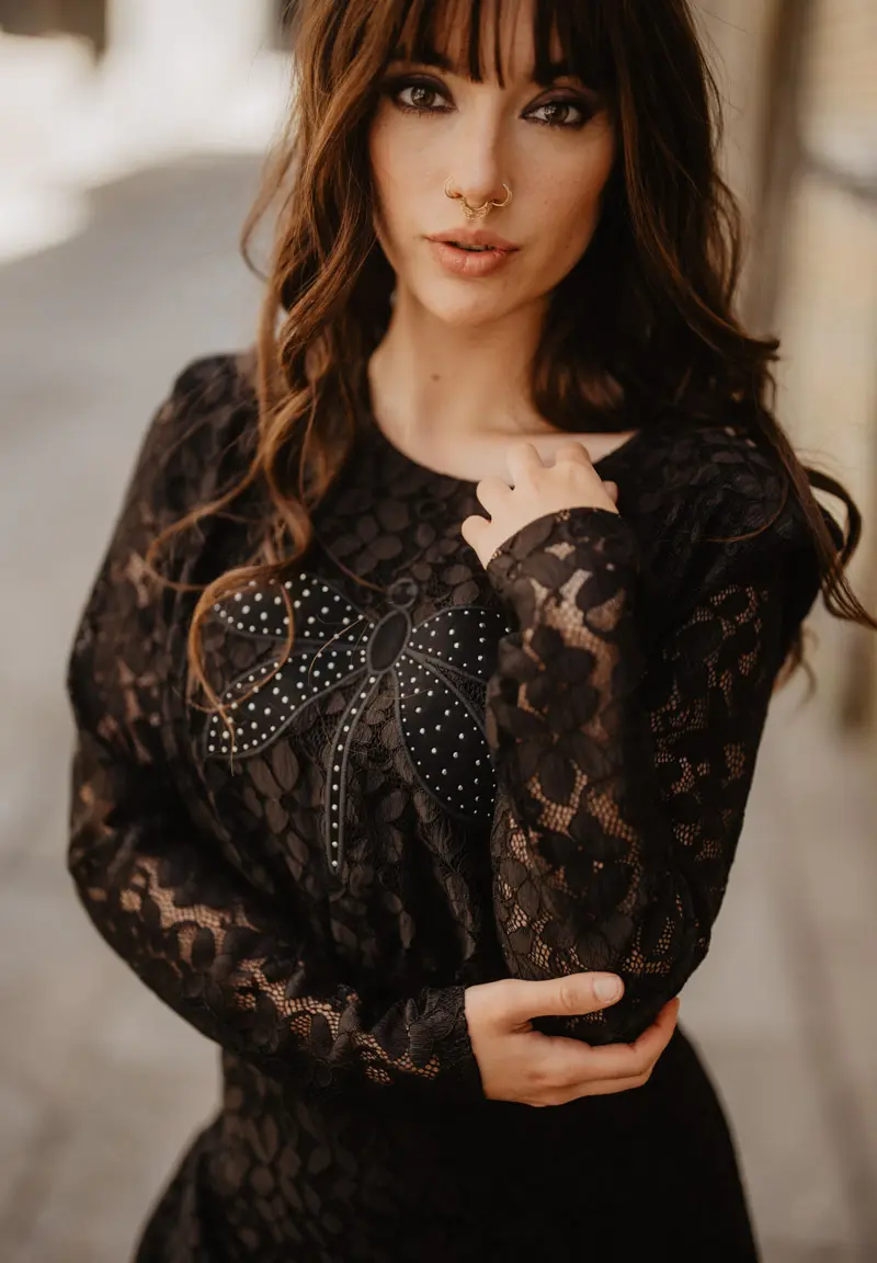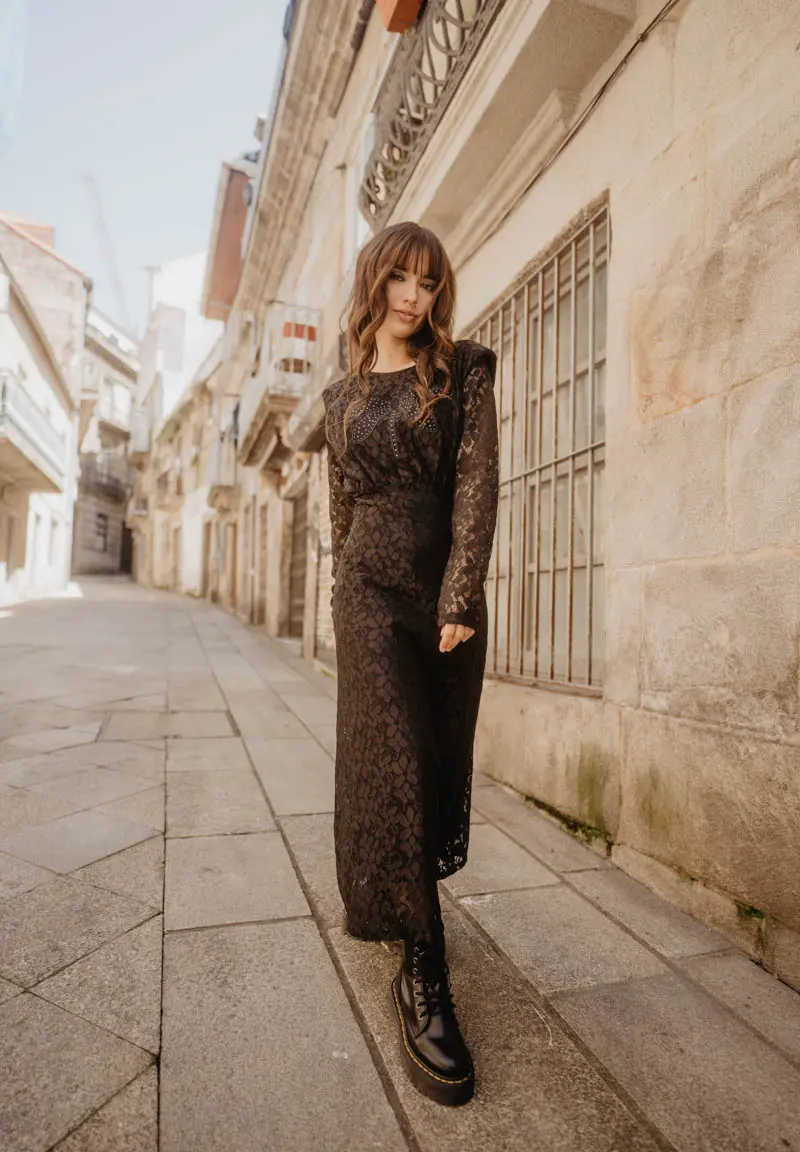 Vestido largo de encaje, con hombreras, fruncido en la cintura. Libélula de un tejido superpuesto, decorada con tachuelitas y bordada en su contorno. Cada hilo entrelazado de este vestido cuenta una historia de dedicación y arte, similar a la metamorfosis de la libélula. Al igual que ella, este vestido te transforma, otorgándote un aire de elegancia y confianza. Ya estás lista para volar hacia nuevas aventuras. Diseño propio y fabricación en Portugal, cuidando hasta el más mínimo detalle. Todas nuestras prendas llevan un marcapáginas con un texto inspirador.